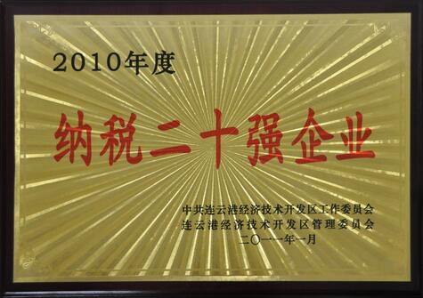 近日,在連云區(qū)政府舉行的開發(fā)區(qū)企業(yè)納稅大戶表彰會(huì)上,我公司被開發(fā)區(qū)管理委員會(huì)授予 “2010年度納稅20強(qiáng)企業(yè)”的光榮稱號(hào)并頒發(fā)獎(jiǎng)金。2010年度,我公司在公司領(lǐng)導(dǎo)及全體員工的共同努力下,銷售額和稅收均創(chuàng)歷史最高。